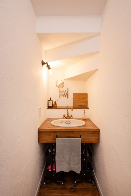 限られた空間でも、ちょっとした棚を設けるだけで、小物が置けて、使い勝手がぐんとよくなります