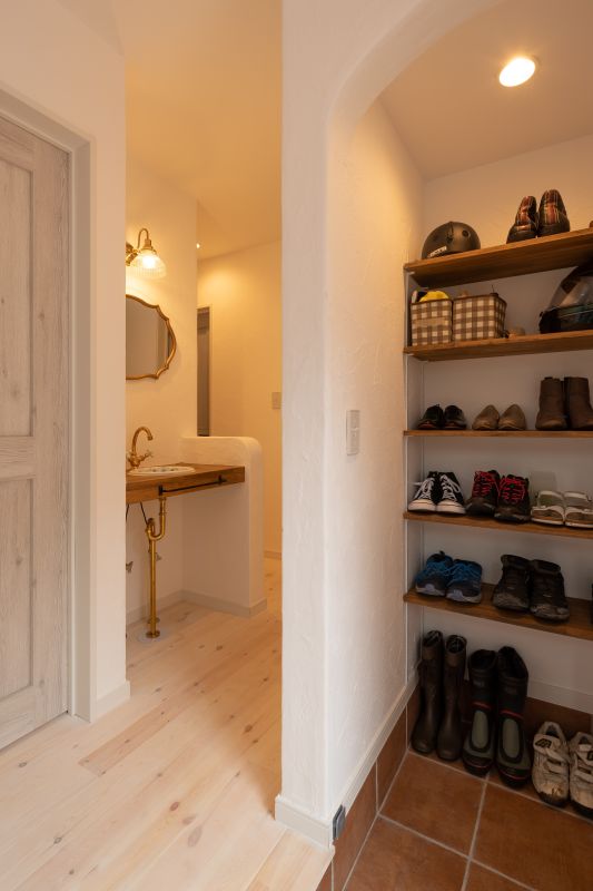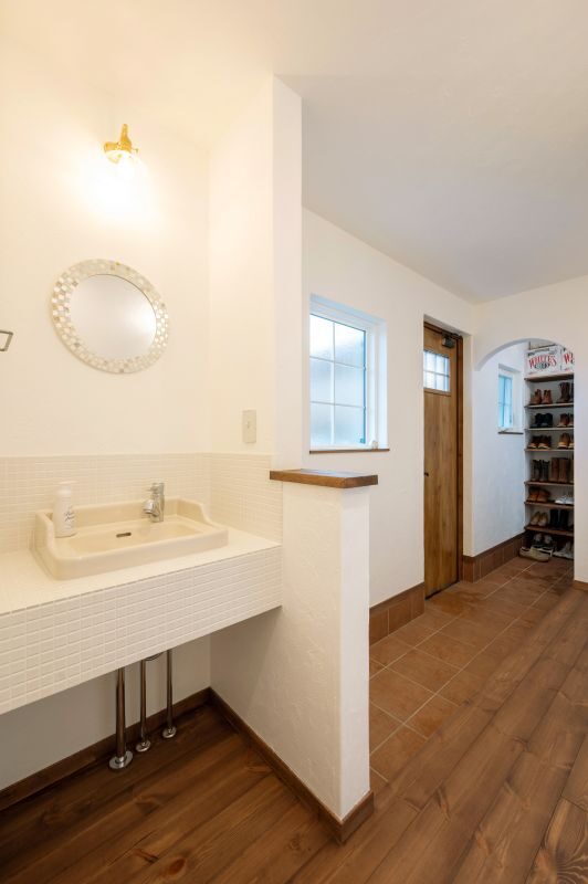 アンティーク調の水栓と洗面ボウルが、玄関のインテリアの一部として空間に馴染んでいます