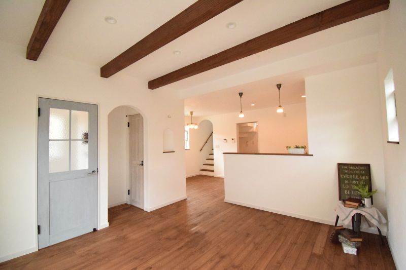 無垢の床材とナチュラルな梁が印象的な、木のぬくもりを感じるリビング