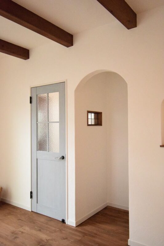 薄いブルーの建具とアールの垂れ壁が、空間にさりげない柔らかさを添えます。